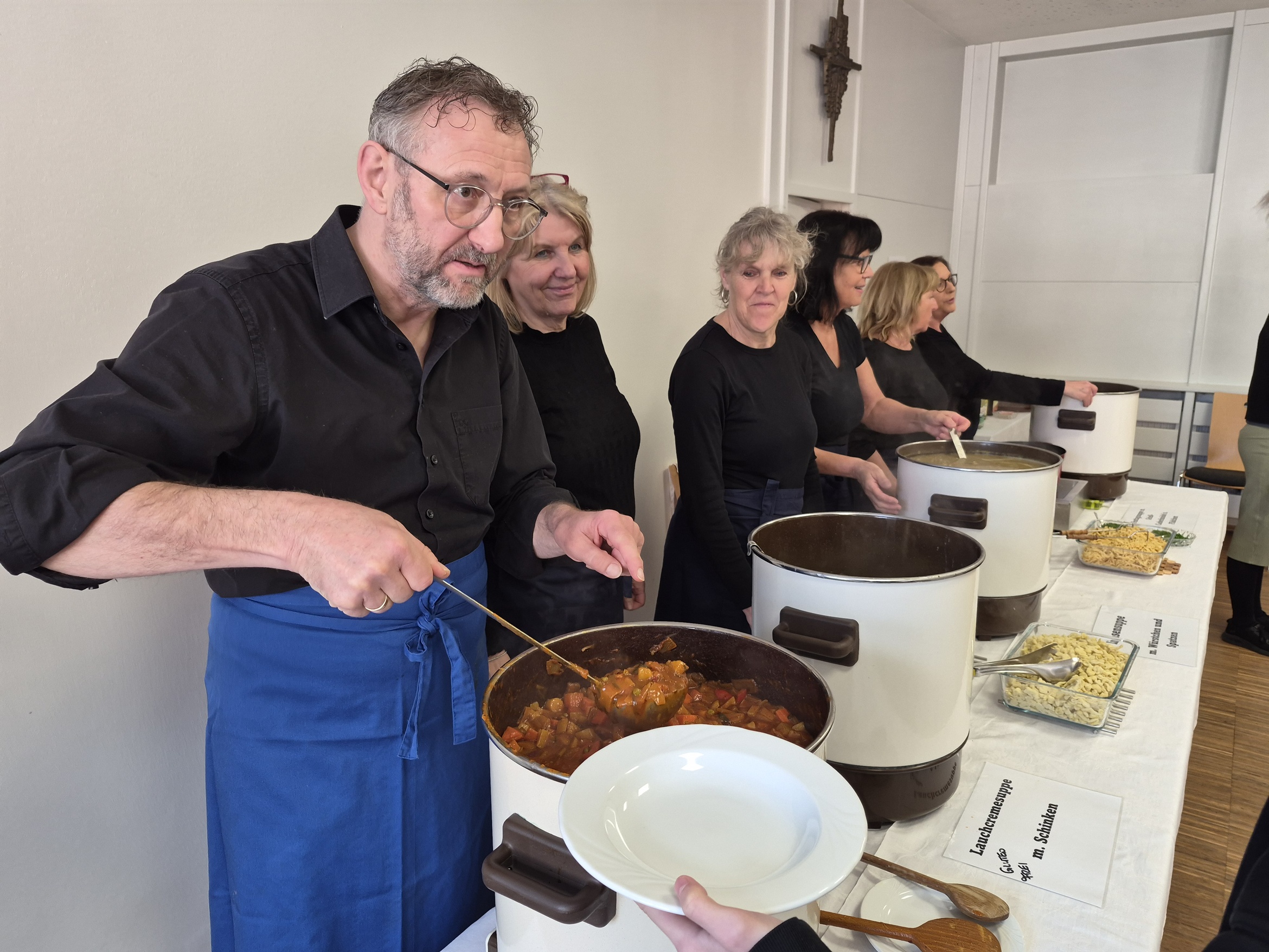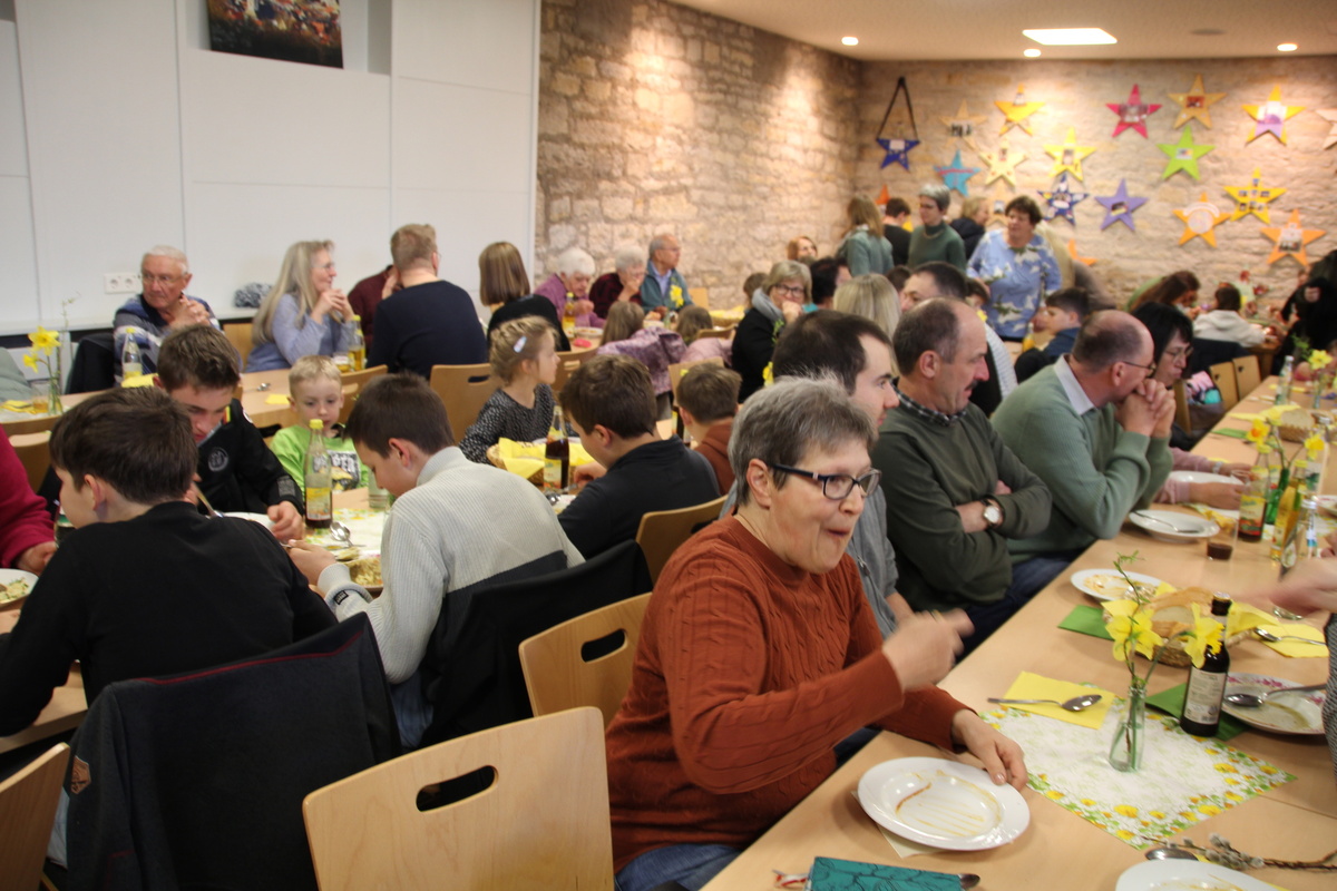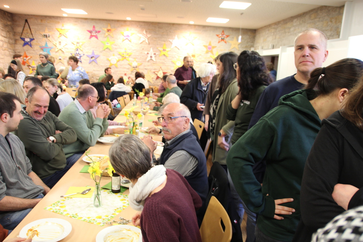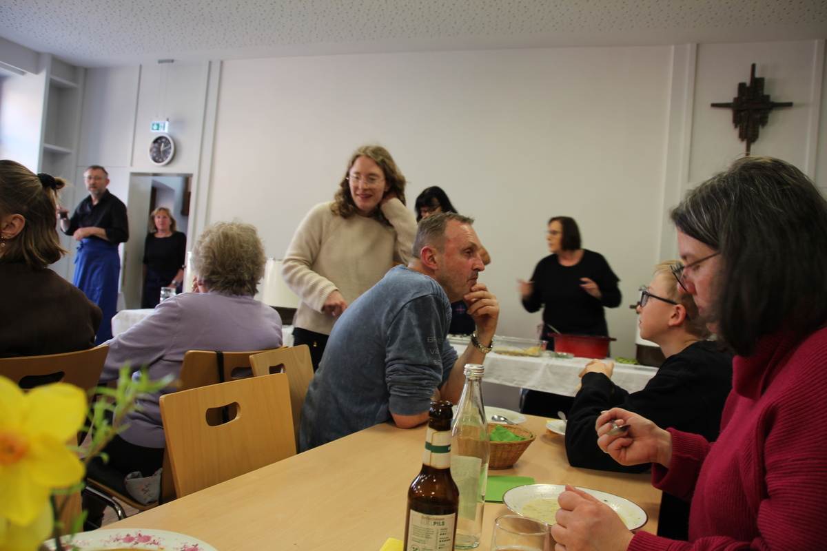 Mit dem Andrang hatten die Köchinnen und der Koch der Fastensuppen nicht gerechnet. Schon kurz nachdem der Familiengottesdienst zu Ende war stürmten die ersten hungrigen Gäste herein. Wenig später war zwischen den Tischen kaum ein Durchkommen. Man musste in den Gruppenraum ausweichen. Der Stimmung tat das keinen Abbruch, selbst dann nicht wenn mal etwas Suppe über den Tellerrand schwappte. Es gab 4 Gerichte, Hochzeitsuppe, Linsensuppe mit Würstchen, Gemüsegulasch und eine Lauchsuppe. Das es den Gästen richtig gut geschmeckt hat war spätestens an dem Spendentopf zu erkennen. 1400 € kamen zusammen und das Brot spendete die Bäckerei Lang. Eine schöne Summe die der Kirchenrenovierung und der neuen Heizung zugutekommen.