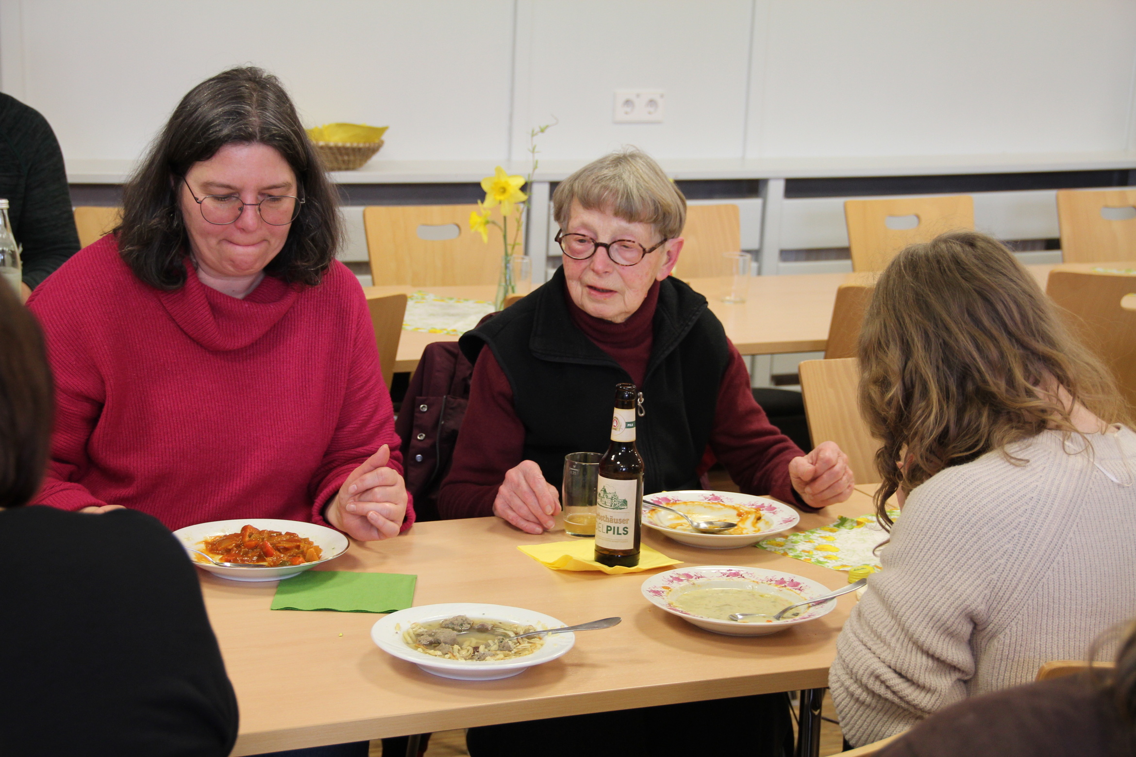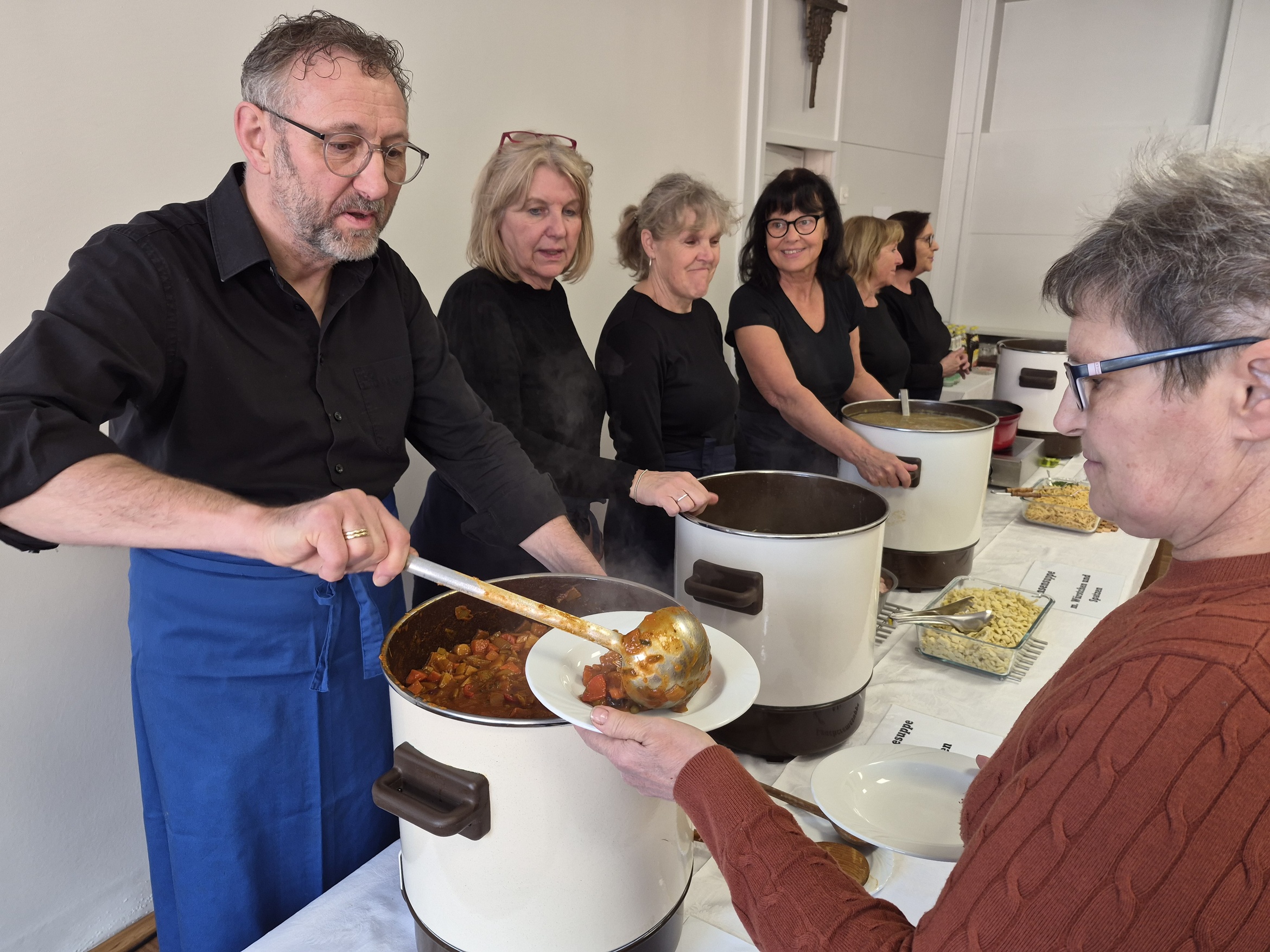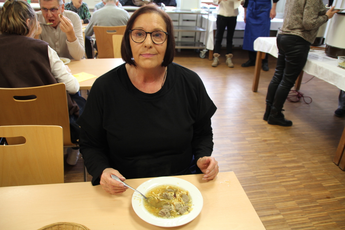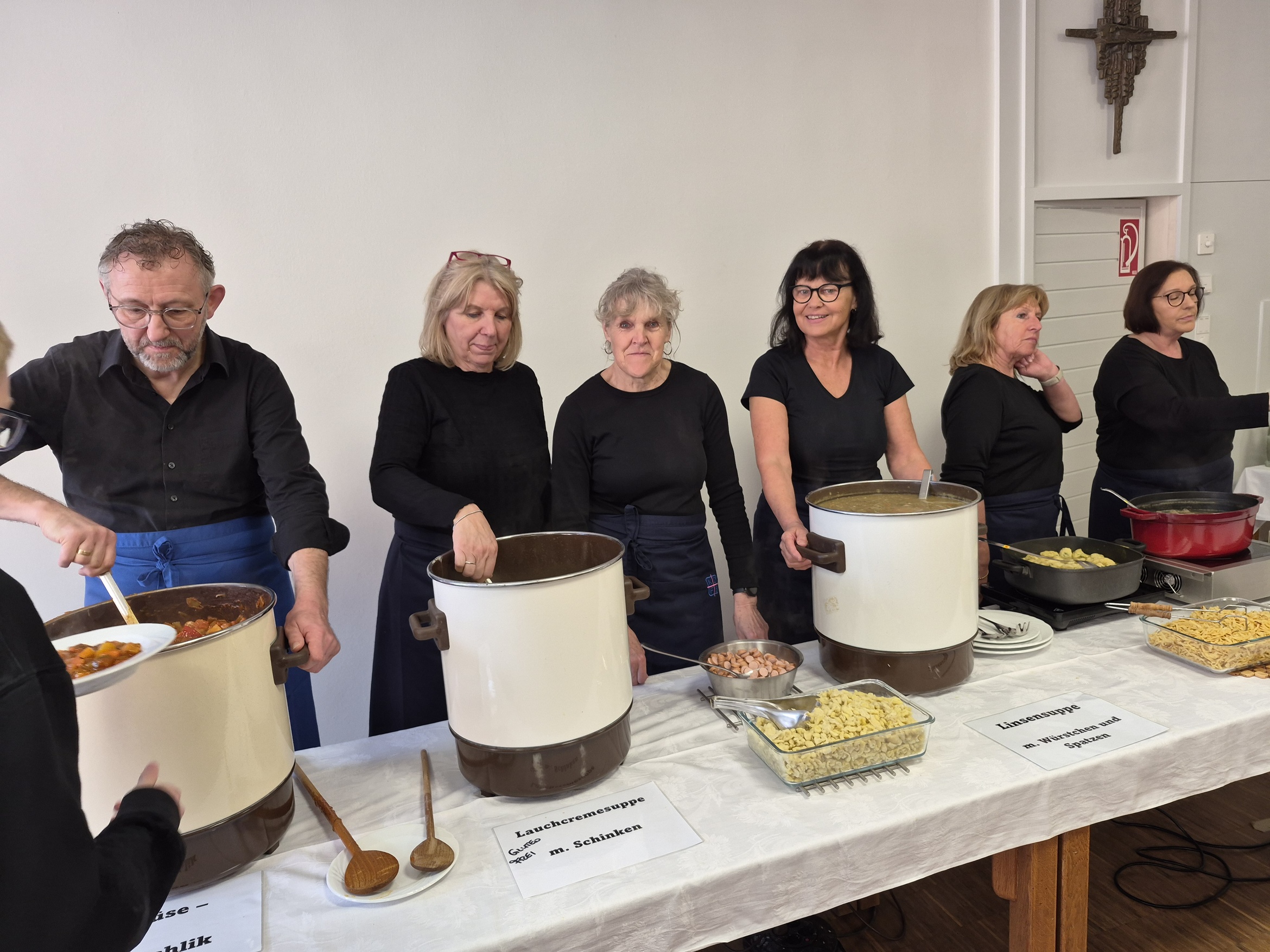 Mit dem Andrang hatten die Köchinnen und der Koch der Fastensuppen nicht gerechnet. Schon kurz nachdem der Familiengottesdienst zu Ende war stürmten die ersten hungrigen Gäste herein. Wenig später war zwischen den Tischen kaum ein Durchkommen. Man musste in den Gruppenraum ausweichen. Der Stimmung tat das keinen Abbruch, selbst dann nicht wenn mal etwas Suppe über den Tellerrand schwappte. Es gab 4 Gerichte, Hochzeitsuppe, Linsensuppe mit Würstchen, Gemüsegulasch und eine Lauchsuppe. Das es den Gästen richtig gut geschmeckt hat war spätestens an dem Spendentopf zu erkennen. 1400 € kamen zusammen und das Brot spendete die Bäckerei Lang. Eine schöne Summe die der Kirchenrenovierung und der neuen Heizung zugutekommen.