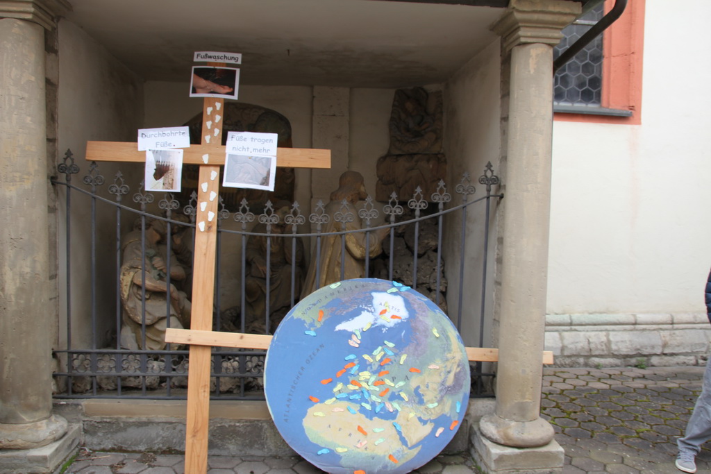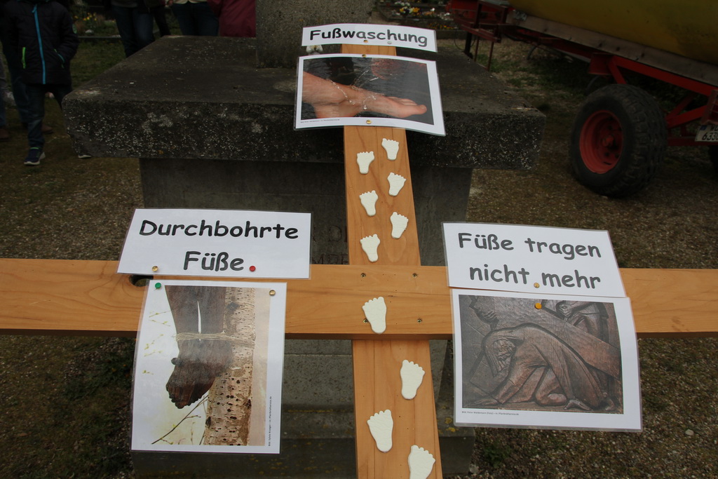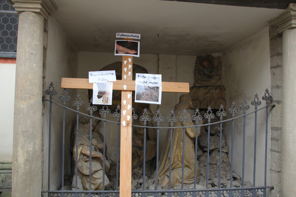 In diesem Jahr hat das Vorbereitungs-Team das Thema Füße gewählt. Jesu Füße gaben auf dem Leidensweg nach Golgatha nach, ER stürzte drei Mal und stand drei Mal wieder auf, seine Füße trugen IHN nicht mehr. Simon von Cyrene half Jesus, das Kreuz tragen, Veronika reichte IHM ihr Tuch um Schweiß und Blut von seinem Gesicht abzuwischen.