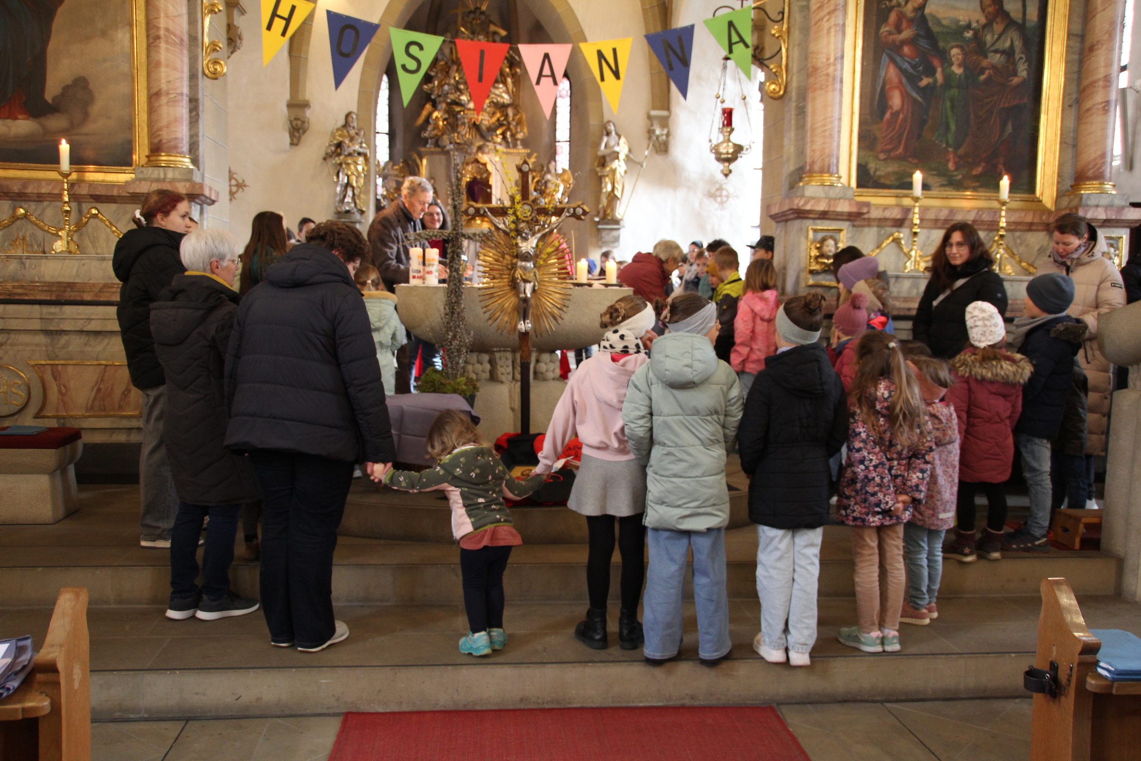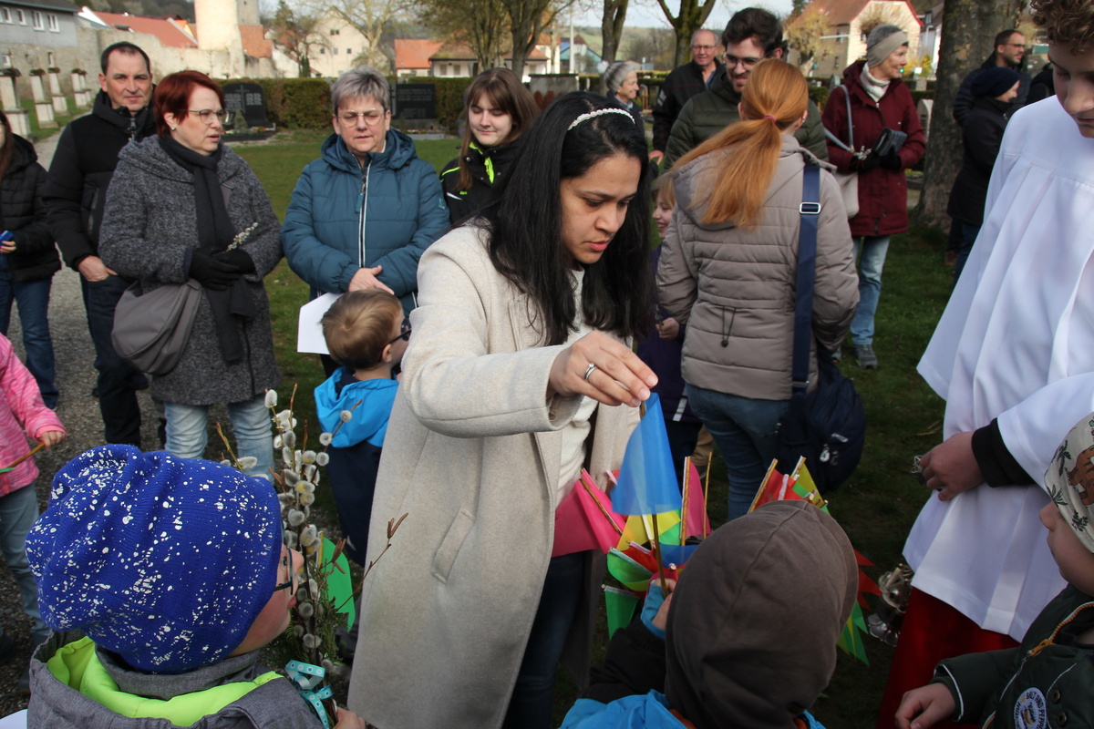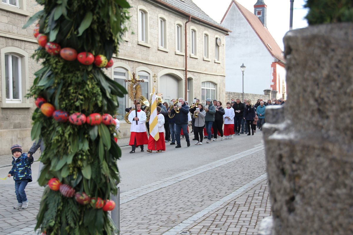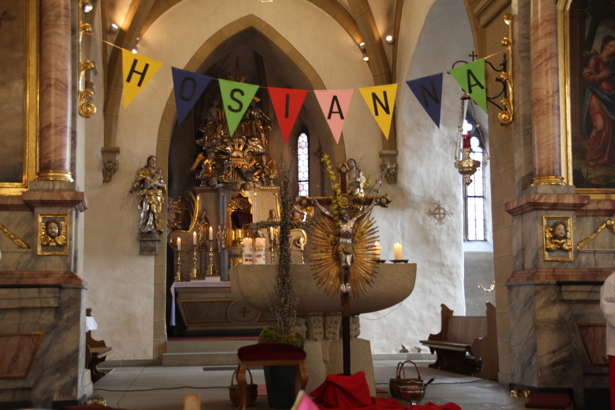 In Röttingen wurden die Palmzweige gesegnet und die Gläubigen hielten sie in den Händen, die Kinder schwenkten Fähnchen und riefen laut Hosianna auf dem Weg in die Kirche.