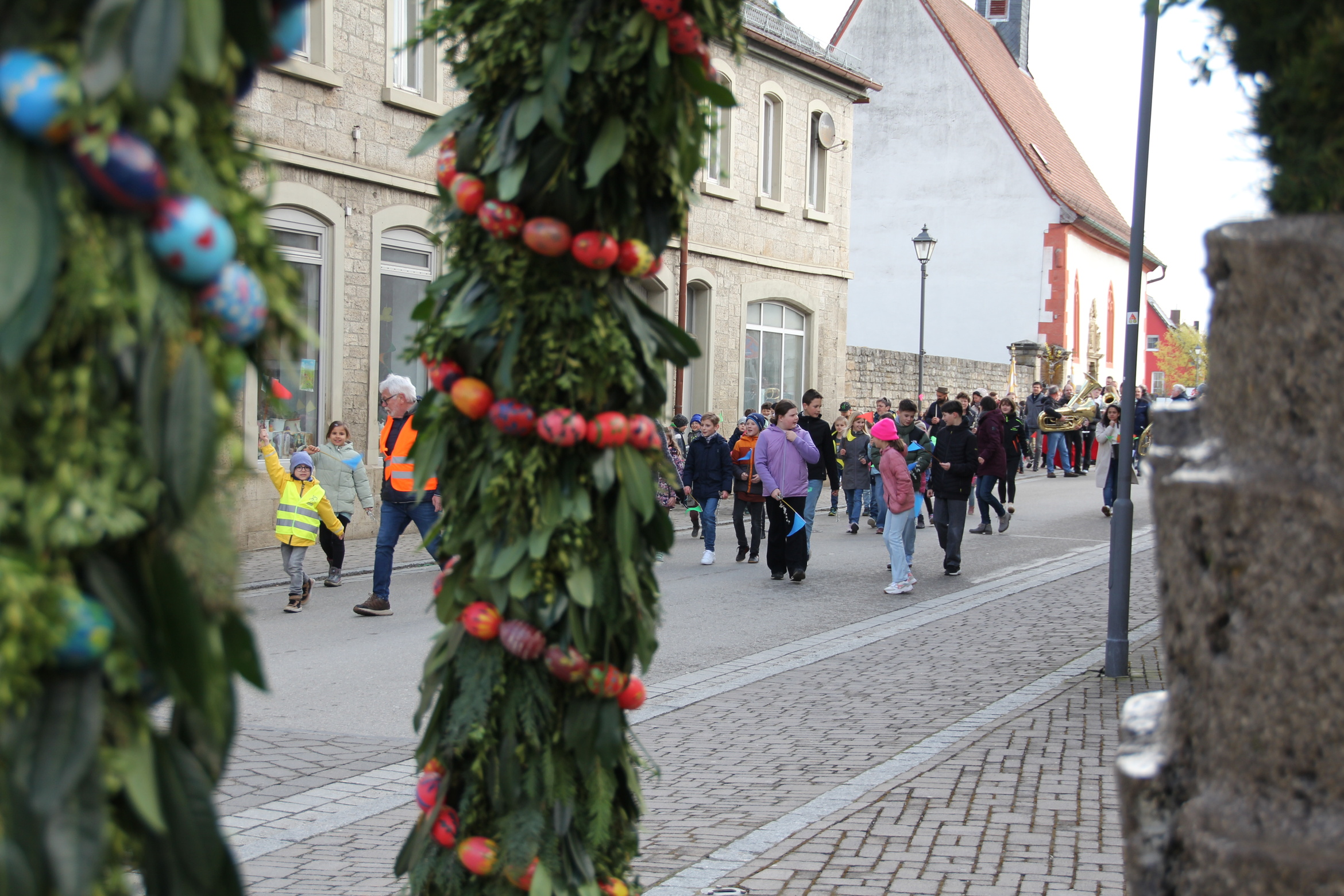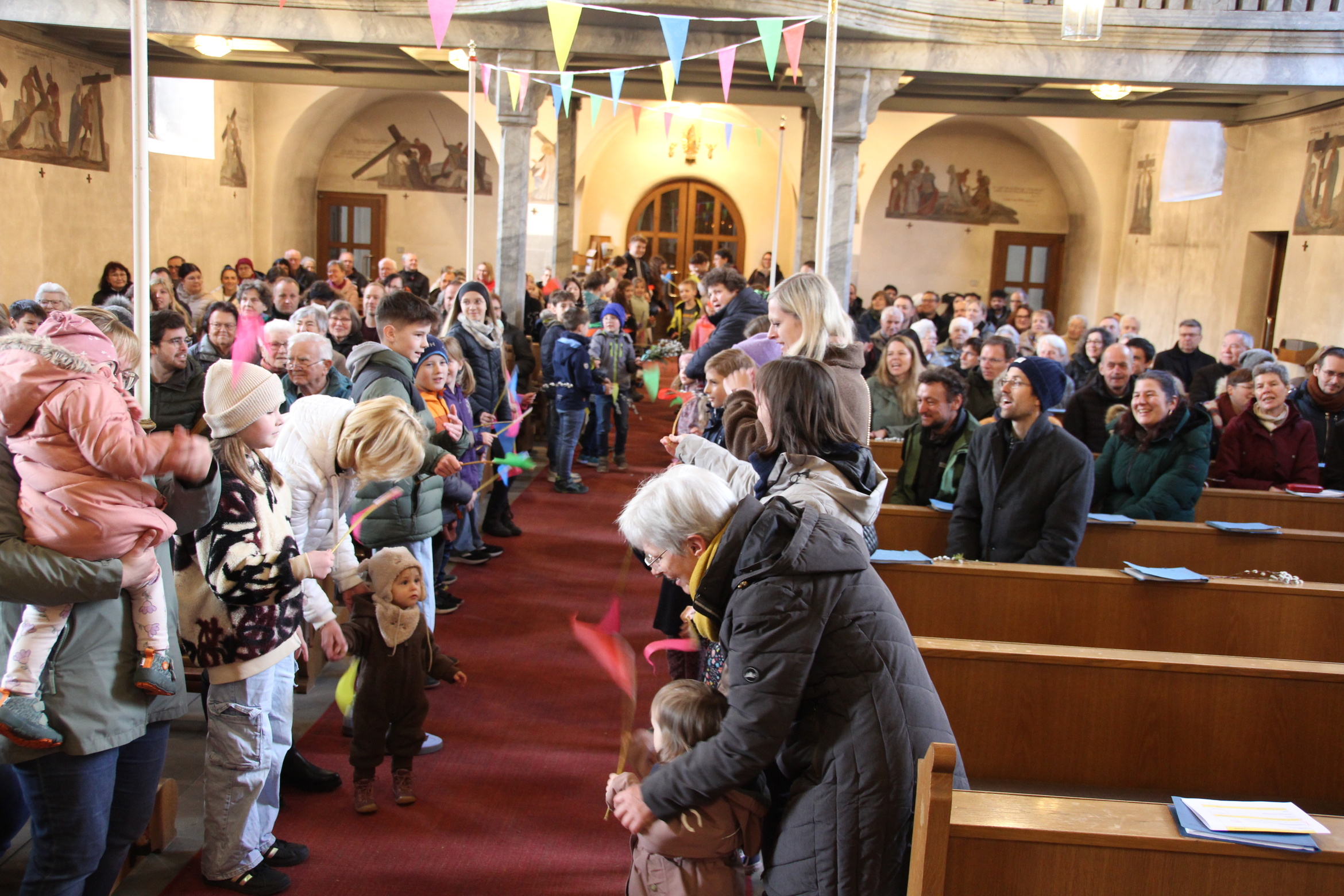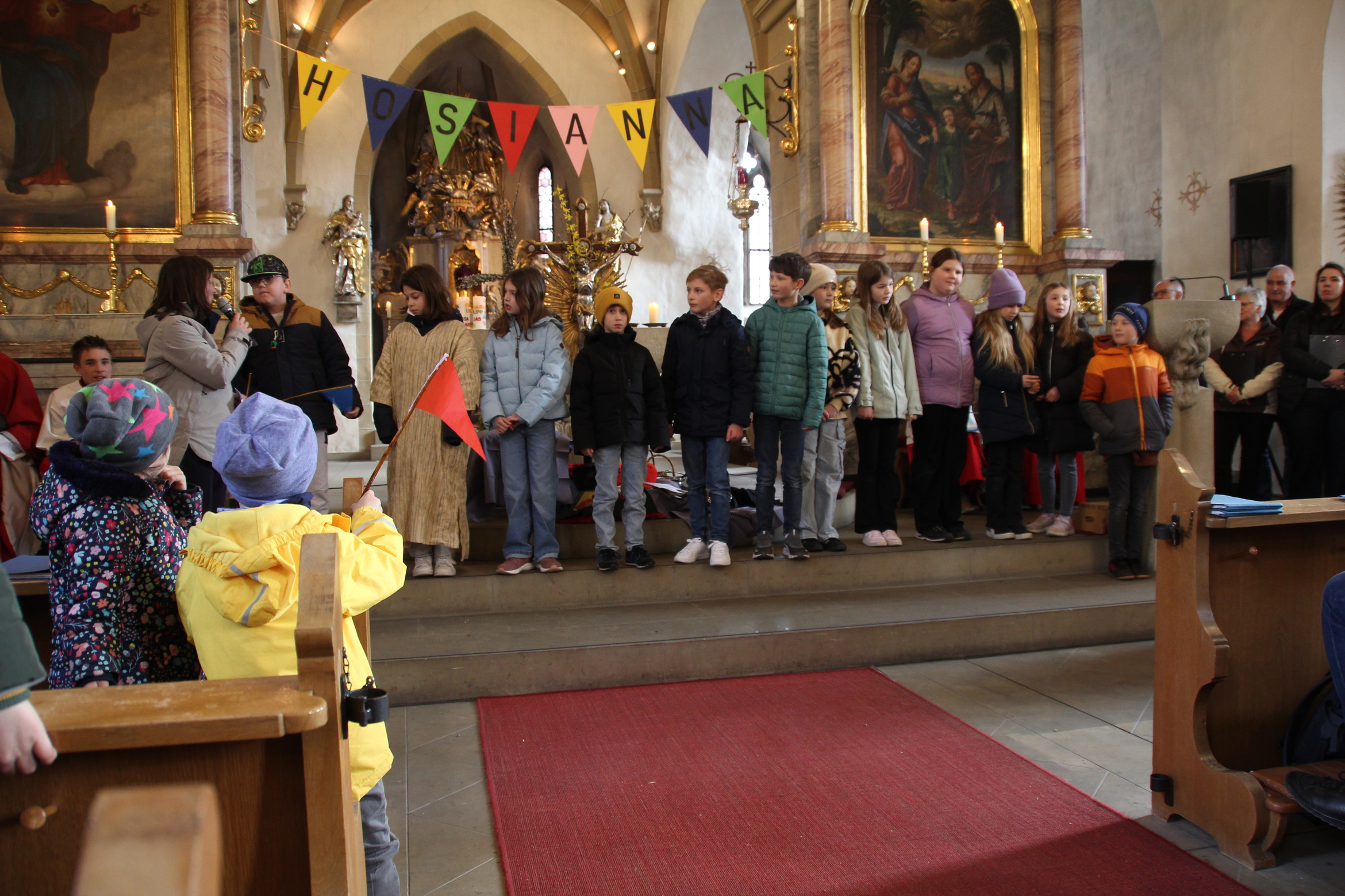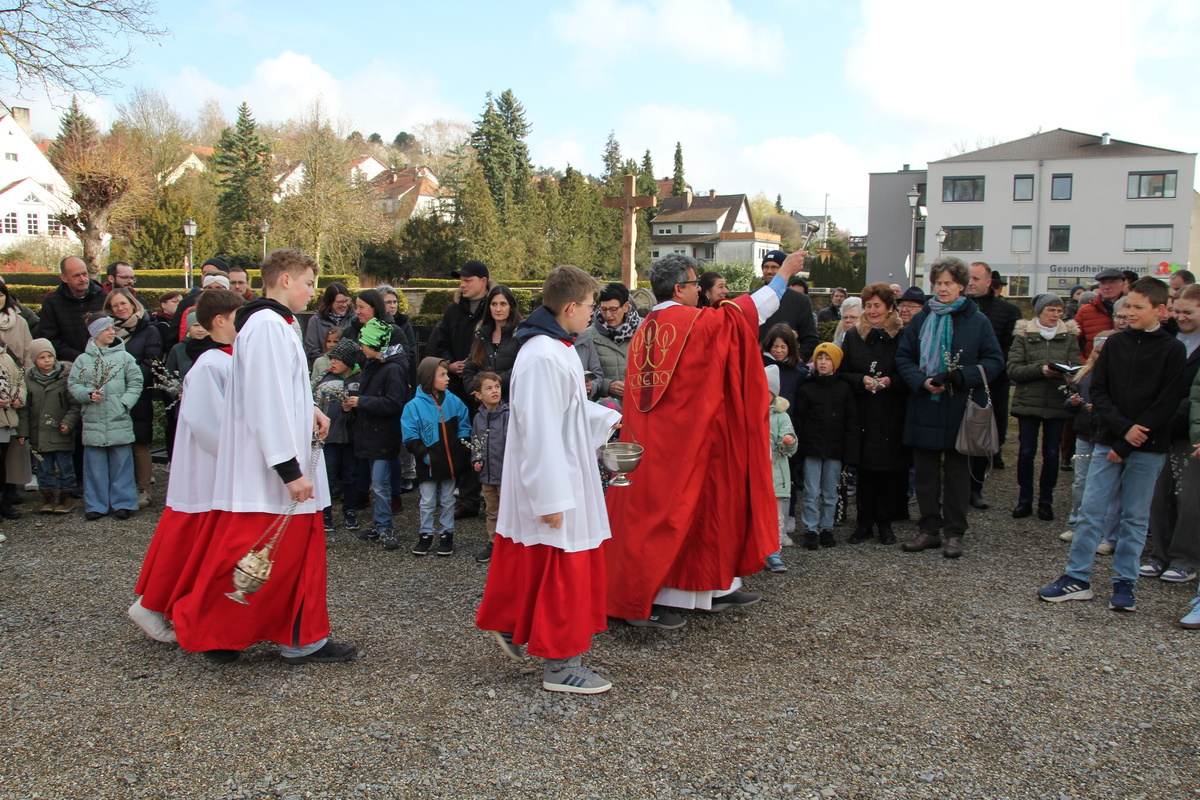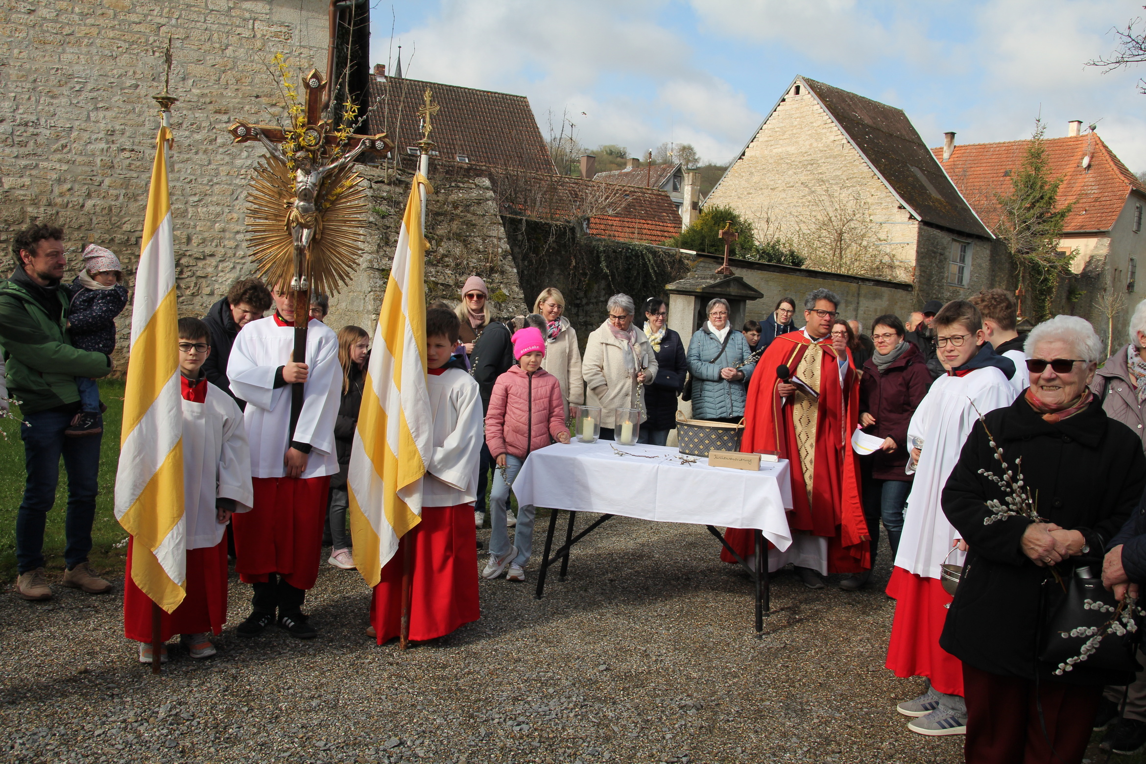 In Röttingen wurden die Palmzweige gesegnet und die Gläubigen hielten sie in den Händen, die Kinder schwenkten Fähnchen und riefen laut Hosianna auf dem Weg in die Kirche.