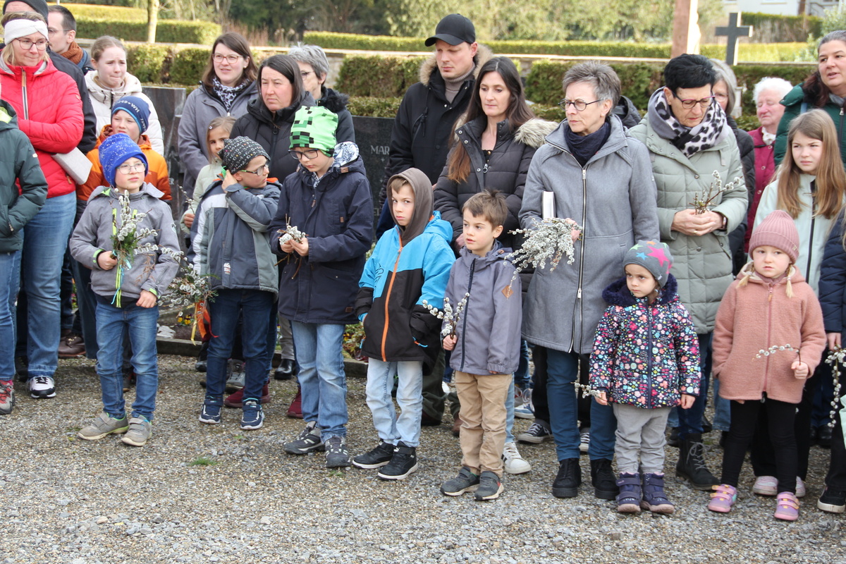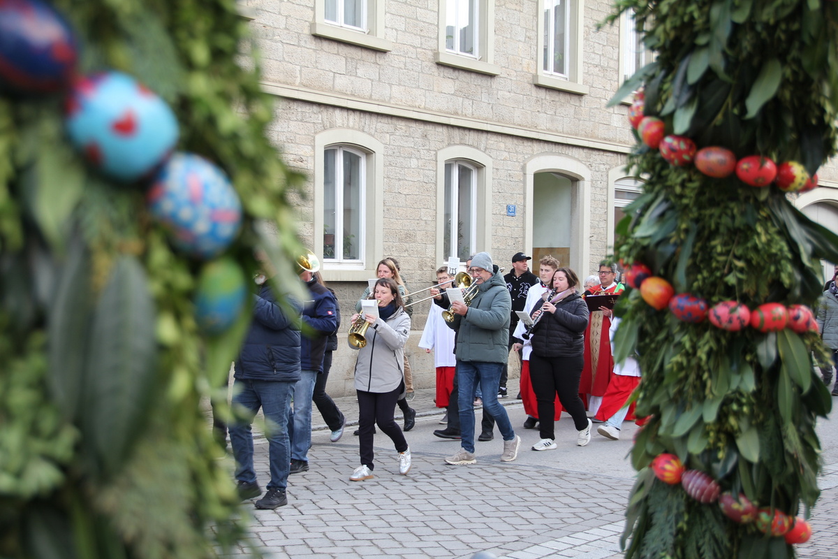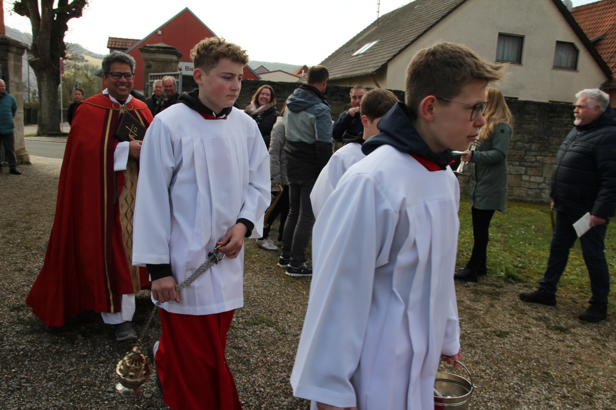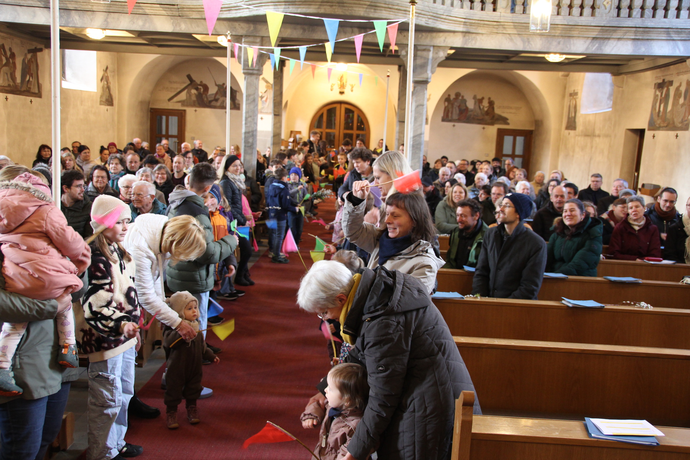 In Röttingen wurden die Palmzweige gesegnet und die Gläubigen hielten sie in den Händen, die Kinder schwenkten Fähnchen und riefen laut Hosianna auf dem Weg in die Kirche.