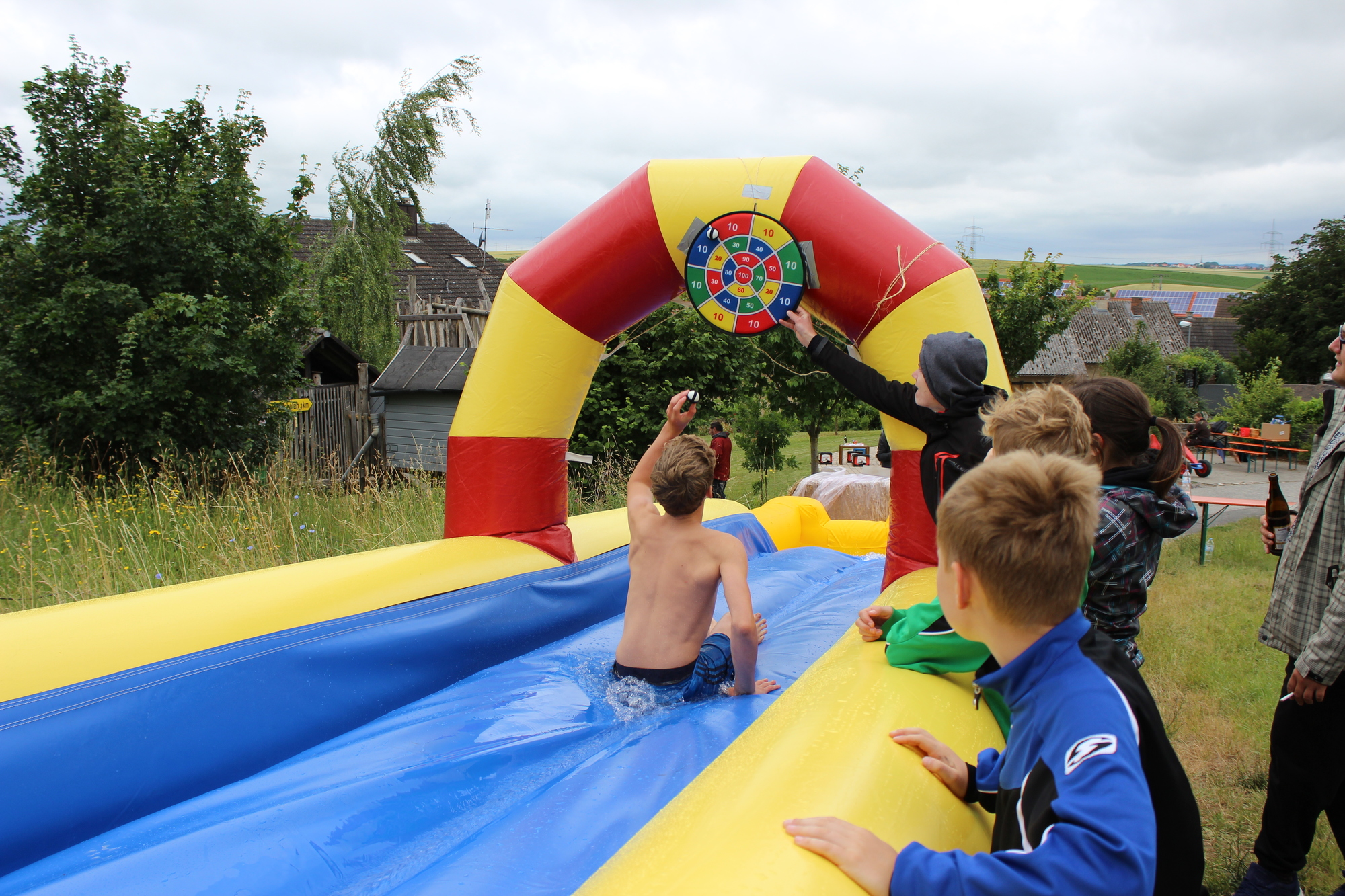 Trotz des regnerischen Wetters machten die Teilnehmer begeistert bei allen Stationen mit, obwohl viele Wasser beinhalteten und auf wärmeres Wetter ausgelegt waren. Neben Sportlichkeit war auch Geschicklichkeit gefragt, zum Beispiel beim Versuch, Tischtennisbälle kontrolliert über Getränkeflaschen zu pusten. Ein Highlight war für die Teilnehmer auch eine aufblasbare Wasserrutsche, von der aus sie während des Rutschens eine Zielscheibe treffen mussten. Bei einem Quiz konnte dann auch noch mit Wissen gepunktet werden.