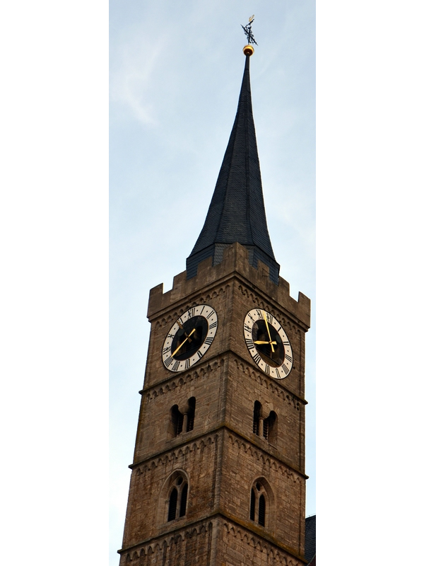 Baugeschichte: Bauzeit der ersten Kirche unbekannt; erste urkundliche Erwähnung einer sicher schon länger bestehenden Kirche 1276; die Kirche ist eine gotische dreischiffige Hallenanlage mit einschiffigem Chor; in der zweiten Hälfte des 14. Jh. wurden Chor und Langhaus in jetziger Form neu errichtet und 1471 die gotischen Seitenkapellen erbaut; Turm aus der Zeit um 1288 mit 6 Geschossen. Innenrenovierung 1987/88.