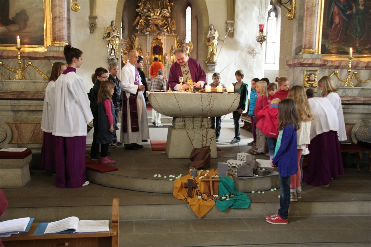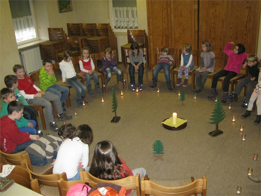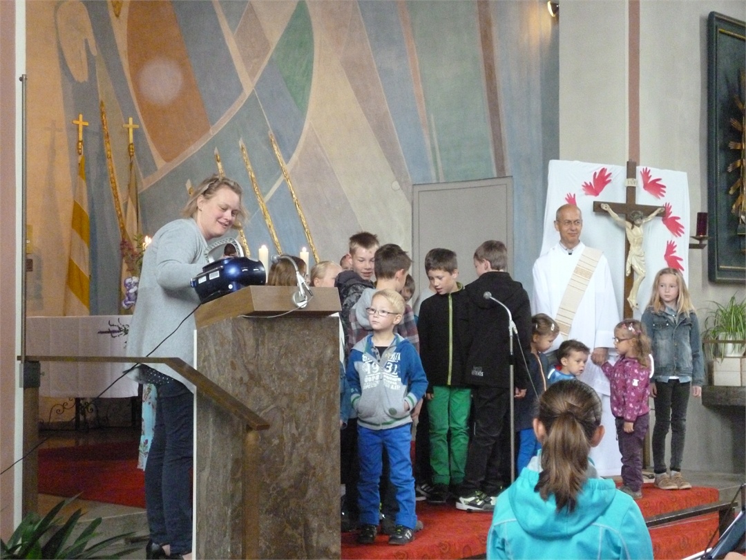 Spielerisch werden die Kinder mit den Themen des Glaubens bekannt gemacht. Gemeinsames Beten und Singen runden die Feier ab.